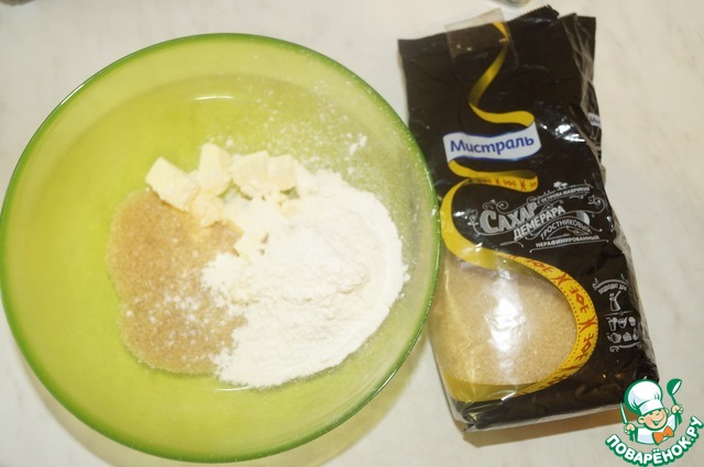 Сначала нужно приготовить штрейзель. Для этого в чашу выложить муку, сахар и сливочное масло.