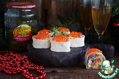 Я поставила рулеты вертикально и украсила икрой. Можно просто положить их и ничем не украшать.