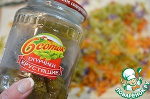 Далее натёртые маринованные огурчики. У меня огурчики ТМ "6 СОТОК". Они очень вкусные, хрустящие, приготовлены с пониженным содержанием уксуса.