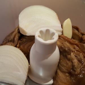 Запечённый баклажан очистить от кожуры и поместить в чашу блендера. Влить сладкий соевый соус. При использовании классического соевого соуса можно добавить щепотку сахара. -