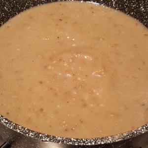 Убавить огонь до минимального или отключить нагрев, выложить баклажановую массу в сотейник. Силиконовой лопаткой тщательно перемешать суп.