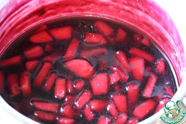 В кисель погружаем пластинки яблока и слегка провариваем минутки 2-3. Не переварите! Если варить больше, то пластинки превратятся в кашу, а это нам совсем не к чему.