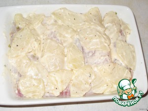 Слой яблочной начинки, слой рыбки, слой яблок… вылить сверху оставшийся соус и поставить в разогретую духовку на 30 минут при 180 градусах.