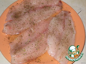 Филе рыбы натереть солью, перцем, присыпать травками, сбрызнуть лимонным соком и оставить мариноваться, пока делаем все остальное.