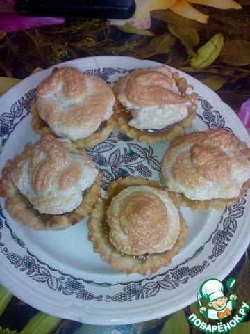 Достаем меренгу из холодильника и при помощи кондитерского мешка или ложки, отсаживаем на тарталетки. Выпекаем при той же температуре 5-7 минут.