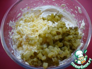 Сверху на сельдь раскладываем приготовленную сливочную массу с яйцами и маринованными огурцами.