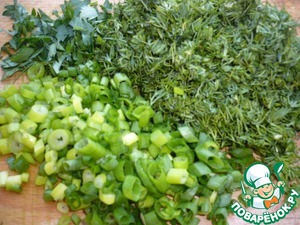 Приступим к сборке рулета. Для этого нарежем зелень. Очень вкусна смесь из укропа, петрушки и зеленого лука.