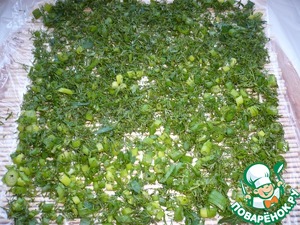 Отрезаем и расстилаем на столе кусок пищевой пленки. Высыпать на пленку нарезанную зелень в форме квадрата или прямоугольника.
