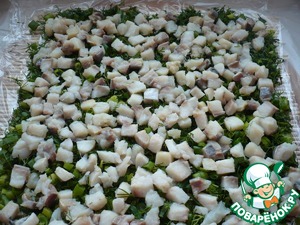 На зелень выкладываем ложкой нарезанное филе сельди.