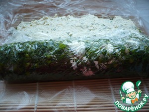 Теперь нужно при помощи пленки аккуратно свернуть все в рулет. Спешить не нужно. Каждый виток стараемся завернуть по плотнее и по всей длине рулета через пленку выравниваем и прижимаем его рукой.