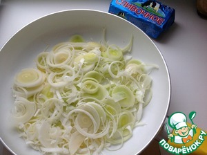 В сковороде растопить сливочное масло. Лук-порей помыть и нарезать тонкими кольцами.