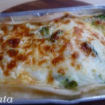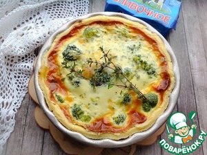 На охлажденное тесто выложить лук-порей, сверху распределить брокколи.