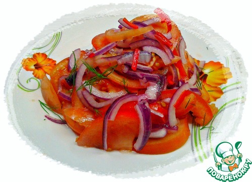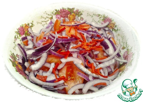 В принципе, этого уже достаточно, но мы добавим нарезанный тонкими колечками острый перец без семян. Если есть желание, можно заправить растительным маслом, зелень — укроп, петрушка или кинза — на ваш вкус. По мне, так хорош и без зелени.