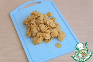 Колбасу (можно использовать ветчину) (100 гр.) нарезать тонкими брусочками.