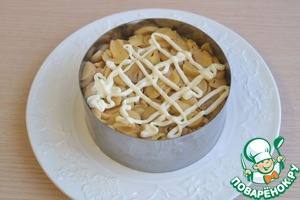 2-ой слой куриное филе. Делаем майонезную сеточку.