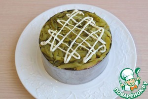 Готовый, собранный салат в кольце посыпать натертым сыром, сделать майонезную сеточку и можно подавать на стол.