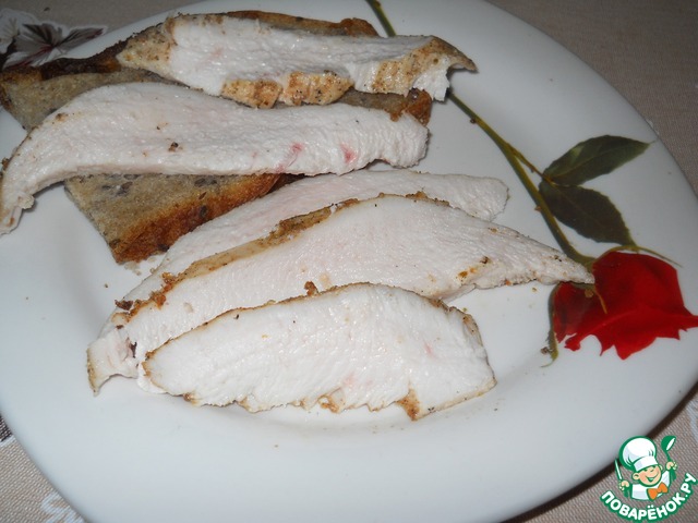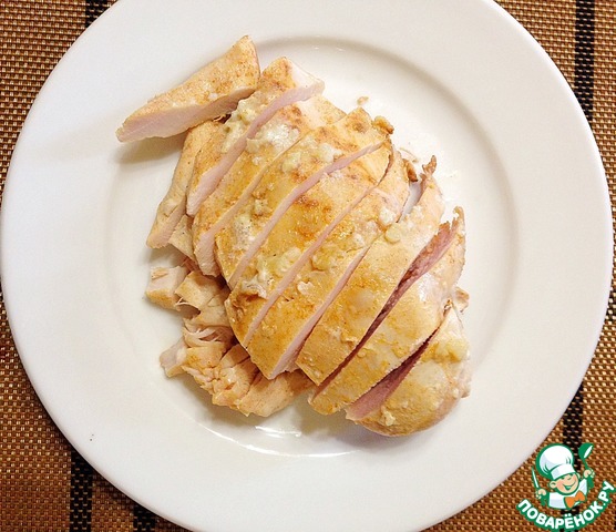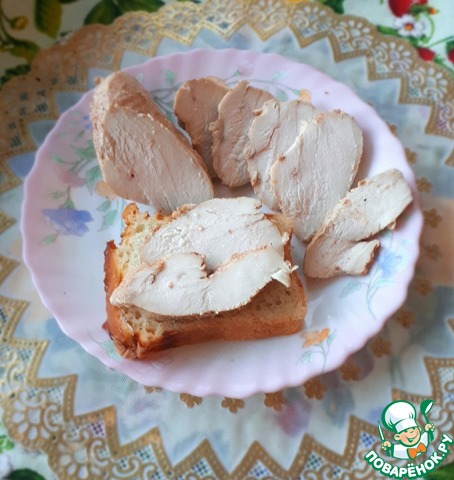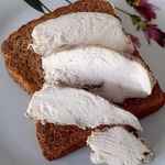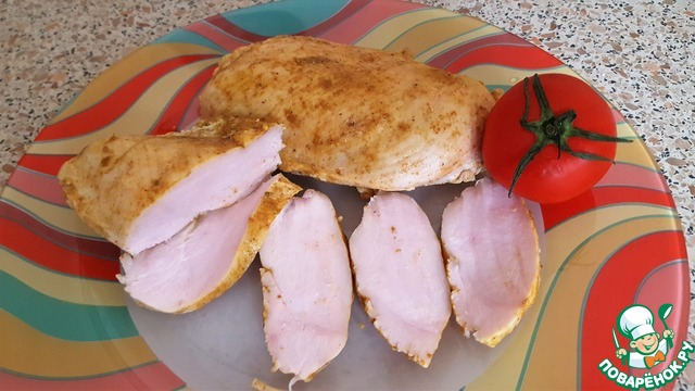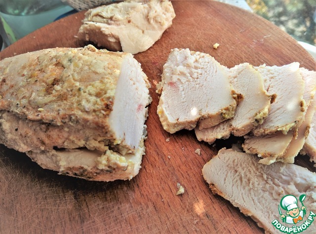 Одну минуту на плите, и мясо доходит само в тепле. В результате получаем нежнейшее, сочнейшее, ароматнейшее бутербродное куриное филе. Вечером заготовили, утром мясо к завтраку. Или утром заложили, ужин сам приготовится. И ко всему прочему, это очень диетично!