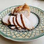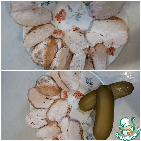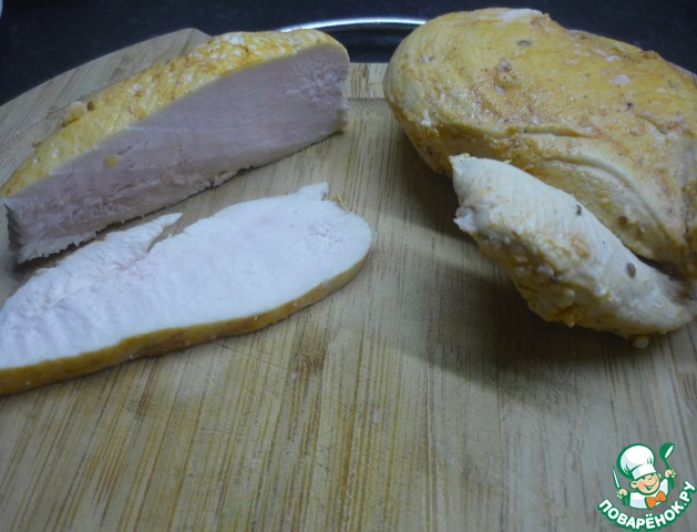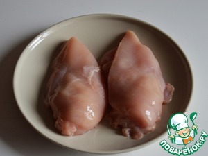 Куриную грудку разделать, удалив косточки, жир. Обсушить.