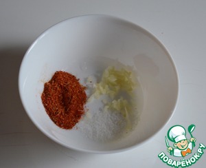 Смешать специи, чеснок, соль, перец. Специи берутся абсолютно любые, по вашему вкусу. Можно и без них, если это готовится для детей.