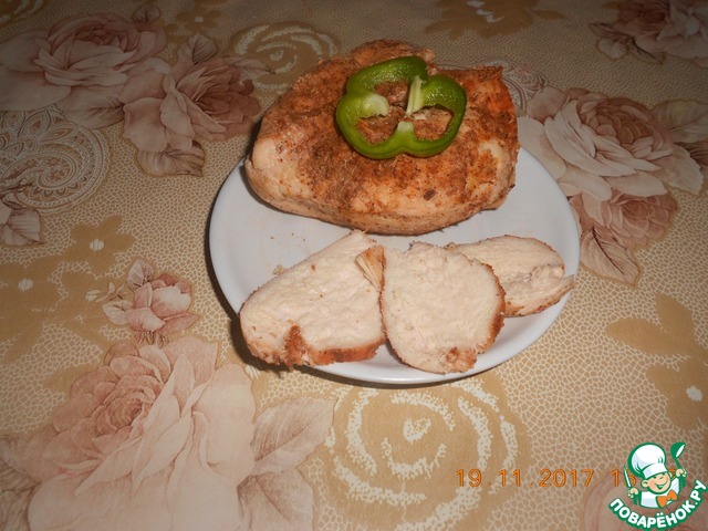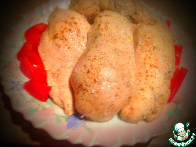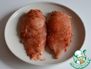 Обсушенные грудки натереть специями, накрыть и оставить на 1 час при комнатной температуре.