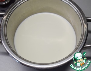В кастрюлю с толстыми стенками и дном влить молоко. Молока нужно столько же, сколько у вас мяса. Т. е. на 500 г. мяса 500 мл молока. Молоко вскипятить.
