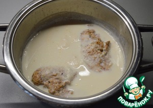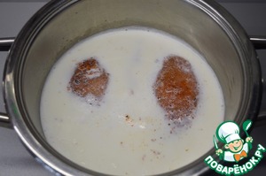 Положить маринованные грудки в закипевшее молоко, дать закипеть, и подержать ровно 1 минуту.