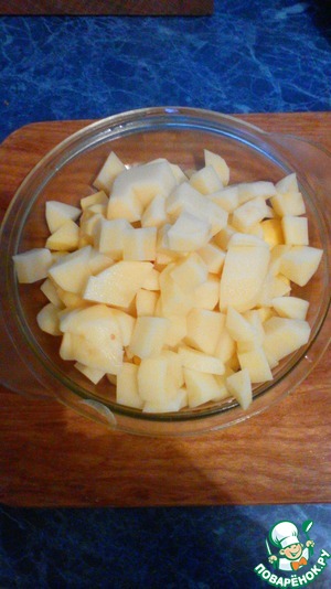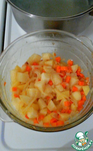 Обжарить на растительном масле лук, морковь и картофель минут 15