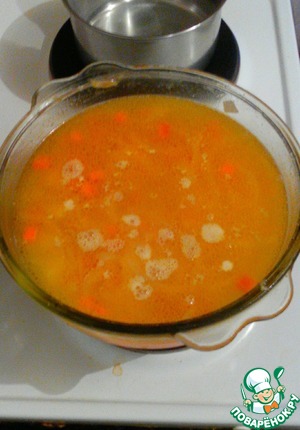 Влить бульон и варить ещё 20 мин при слабом кипении до готовности моркови. Она должна быть мягкой