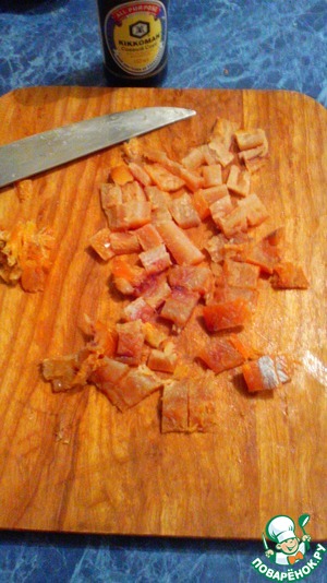 Пока варятся овощи, копченую рыбу разделать на филе, очистить от шкурки