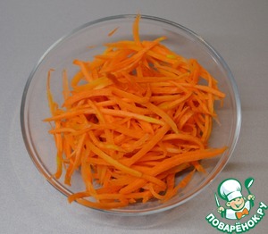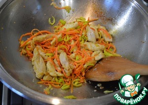 Затем добавьте курицу, натертую морковь и нарезанный порей. Обжарьте 3-4 минуты. Затем добавьте 1 чайную ложку соли, сахар и соевый соус и готовьте еще 1 минуту.