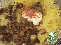 Картошку откинуть на сито, дать стечь воде, добавить грибы, посолить, поперчить, добавить паприку, сметану, все хорошо перемешать и выложить поверх мяса.