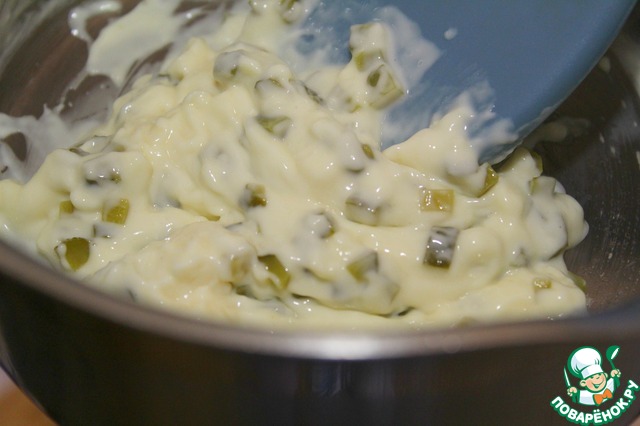 Корнишоны мелко нарезать, всыпать в расплавленный сыр и перемешать.