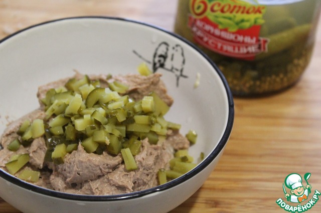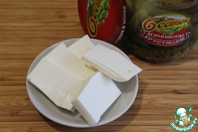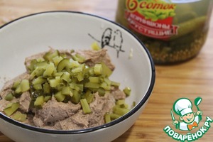 Мелко порезать корнишоны на кубики, оставив два корнишона на подачу - по желанию.