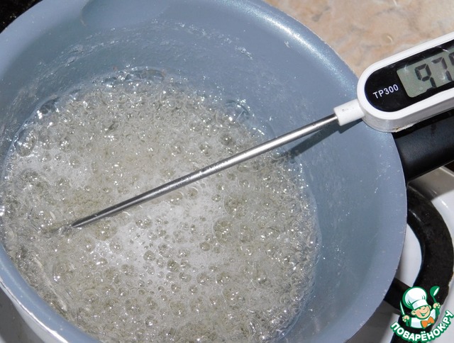 Для крема ставим вариться сироп из сахара и воды. Когда он закипит добавляем лимонную кислоту. Варим сироп до 120С.