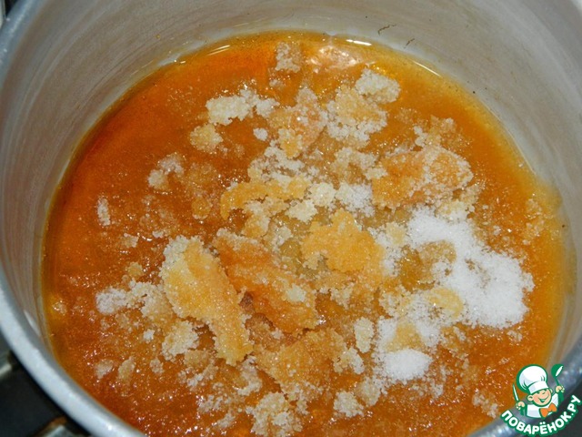 ... добавляем в массу и снимаем с огня. Немного остужаем и добавляем набухший желатин. Перемешиваем, чтобы желатин растворился. Затем всю массу остужаем до комнатной температуры.