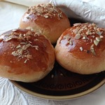 В желток добавить чайную ложку воды, перемешать и обмазать булочки. Посыпать тыквенными семечками и сахаром.