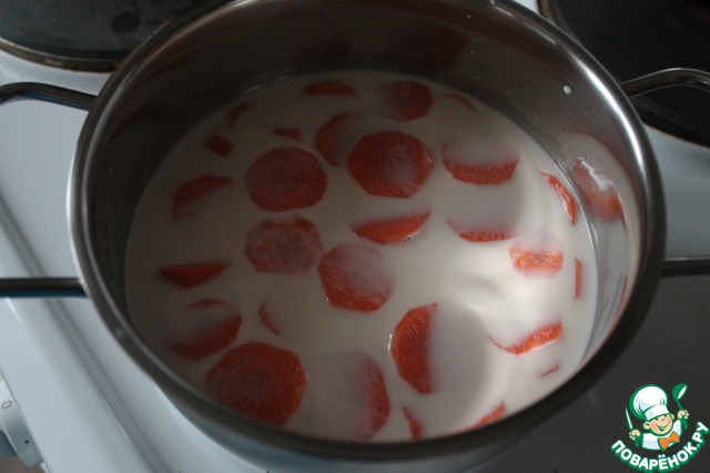 Морковь очистить, нарезать кружочками и отварить в молоке до мягкости (этой займет около получаса).