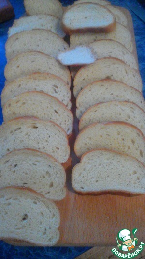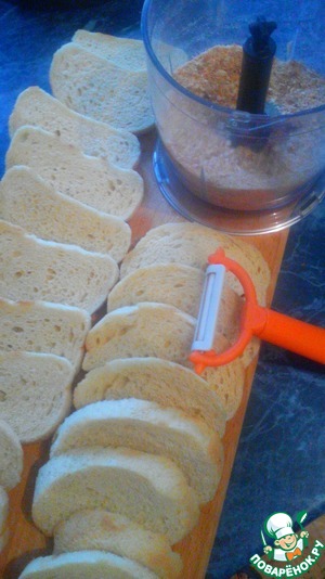 Батон нарезать. Можно сразу взять нарезной батон. Главное, чтобы он был не свежим, а слегка зачерствевшим. Так легче очистить от корочки
