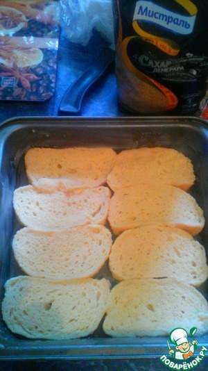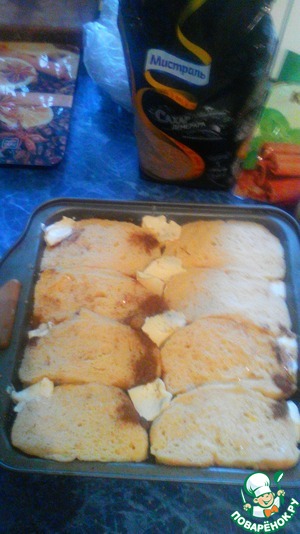 Густо засыпьте их сахаром, смешанным с корицей и мускатным орехом. Я использовала тростниковый от Мистраль™, так как мне нравится его карамельный вкус с медовой ноткой. Он хорошо сочетается с пряностями и яблоками. Потом снова слой ломтиков батона, слой яблок и так до самого верха. Закончить слоем ломтиков батона.