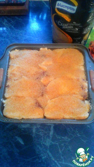 Сверху посыпьте сахарным песком, который даст красивую корочку. И поставьте в умеренно нагретую духовку минут на сорок.