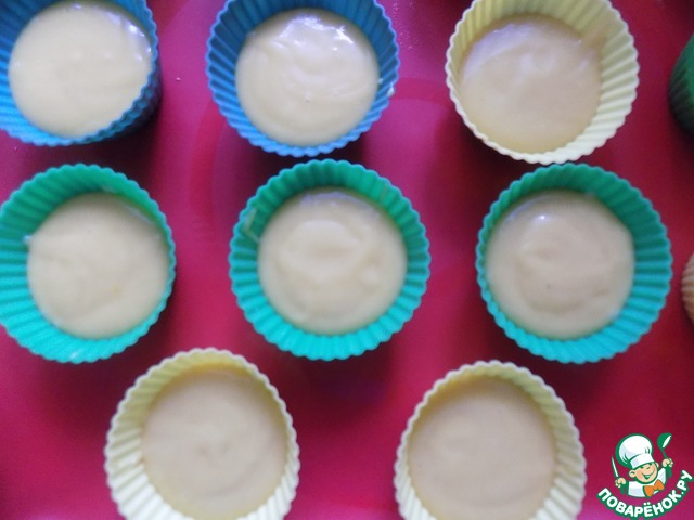 Разложить тесто по формочкам примерно на 2/3 высоты и выпекать при 180 град. примерно 20 мин. до пробы на сухую зубочистку.