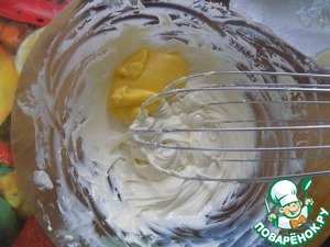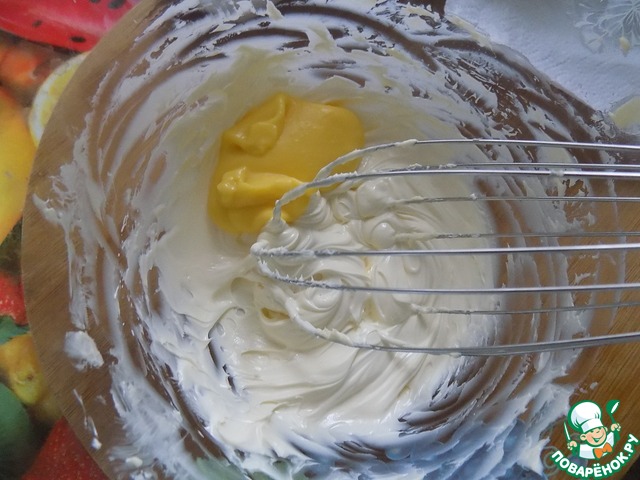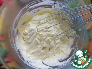 Накрыть заварную часть пищевой пленкой в контакт. Размягченное сливочное масло взбить и, продолжая взбивать, добавлять по 1 стол. ложке заварную часть.