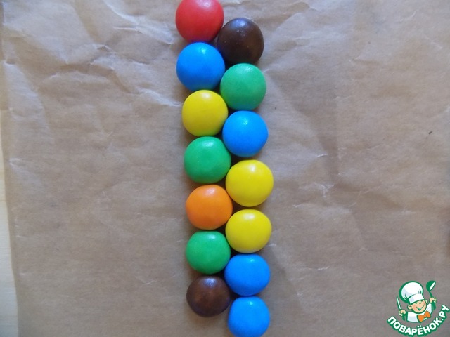 Для украшения растопить шоколад (я делаю это на водяной бане)и обмазать им соломку. Автор рецепта просто обсыпал соломку конфетками и ставил застывать, но у меня так не получилось, конфетки категорически не хотели держаться на соломке, поэтому я сначала разложила конфеты как показано на фото, положила на них обмазанную с одной стороны шоколадом соломку и поставила застывать в холодильник на 15 мин. Затем обмазала соломку с другой стороны и опять положила на таким же образом разложенные конфеты, отправила в холодильник. Затем заклеила конфетами пустоты.