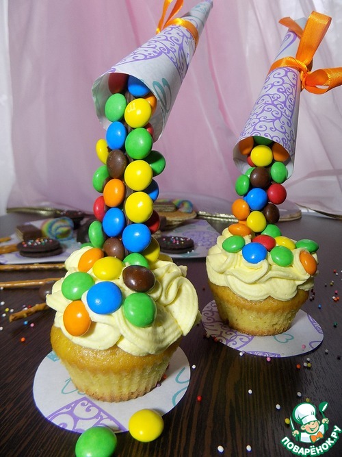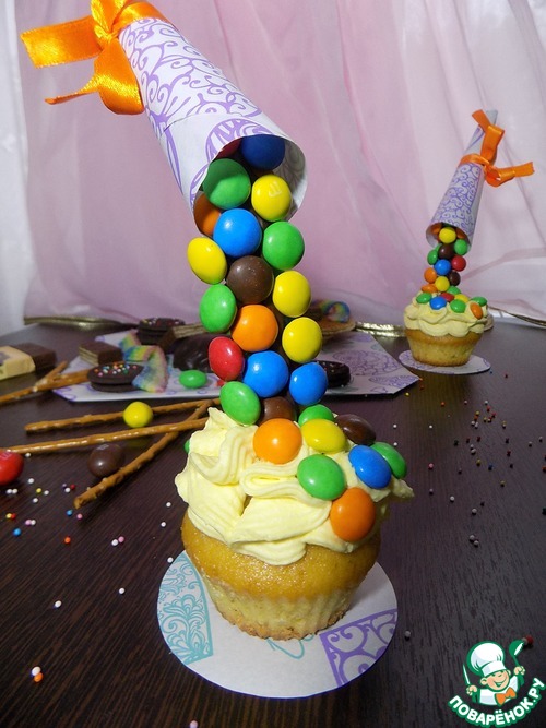 Теперь вставляем украшения в капкейки, сверху надеваем пакетик от конфет или самостоятельно сделанный кулечек и удивляем родных и гостей! Приятного аппетита!