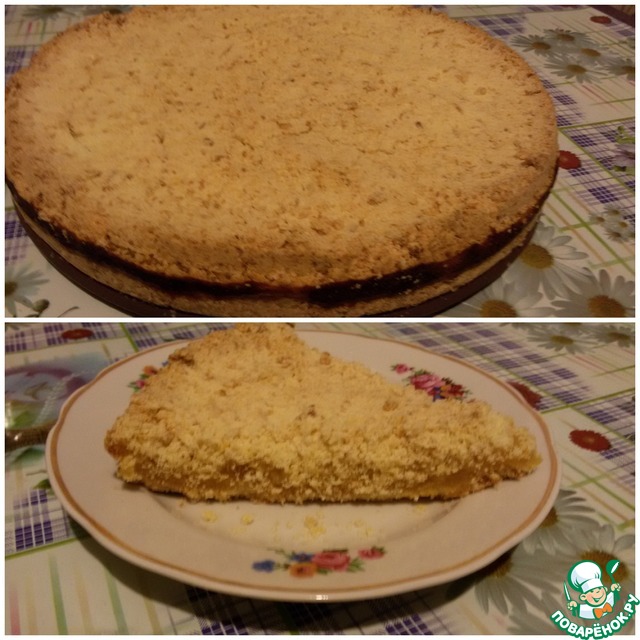 Оставшейся крошкой закрыть начинку. Отправить пирог в духовку при 180 гр на минут 40-50. Как верхний слой начнется зарумяниваться-пирог готов. Дать пирогу полностью остыть, за это время начинка "схватится". Она совсем не течет и пирог "не намокает".
