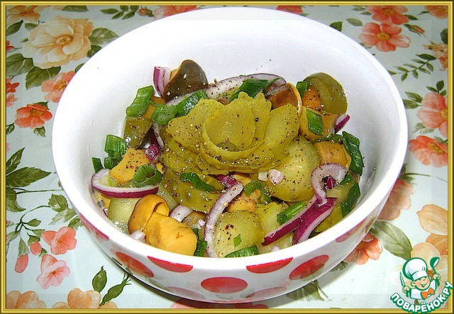 Этот салат очень полюбится мужчинам. Муж часто просит приготовить его на праздники, когда ждем гостей. Салат замечательно возбуждает аппетит, это прекрасная закуска к крепким напиткам. А как к отварной картошечке хорош! Вообщем, прошу к столу!
