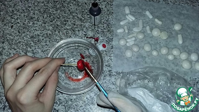 Собрать грибы с помощью взбитого белка. Подсушить в духовке еще 15 мин. При желании, их можно покрасить пищевым красителем.