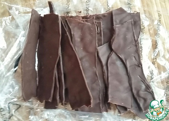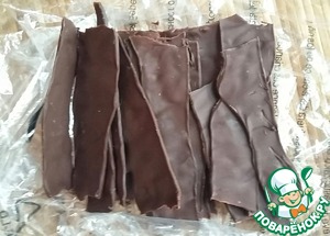 Шоколад растопить на водяной бане. Немного остудить и нанести на пергамент или коврик тонким слоем, в виде двух полос, примерно, по высоте будущего торта. Сделать поперечные полосы, можно неровные, имитируя кору дерева. Отправить в холод на 30 мин. После, разломить на части, хранить в холоде до момента украшения.