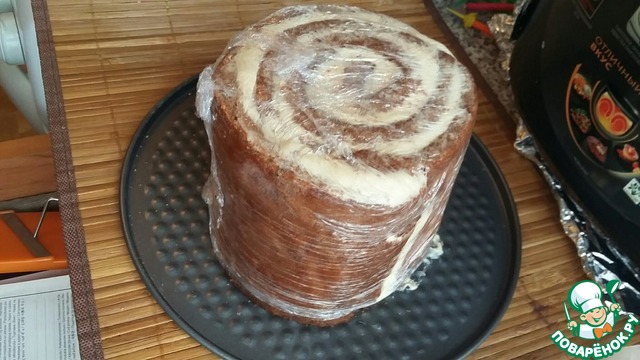 Туго обернуть рулет пищевой пленкой и убрать в холод на несколько часов, а лучше на ночь. -