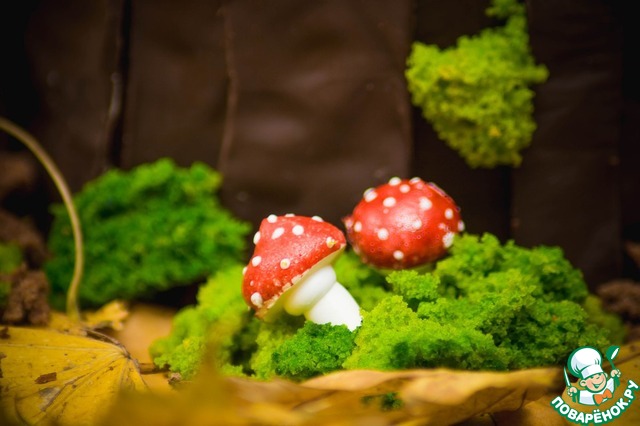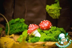 Украсить торт рваным мхом и грибочками так, как вы пожелаете.